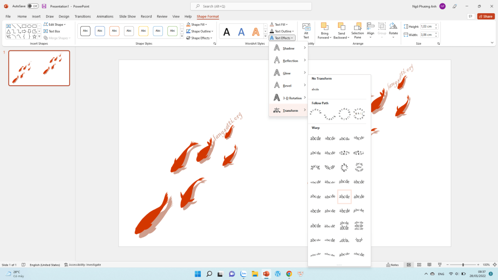 VD ở đây mình muốn uốn chữ theo logo nên mình vào Text effect >> Transformation và chỉnh tiếp đến khi ưng ý