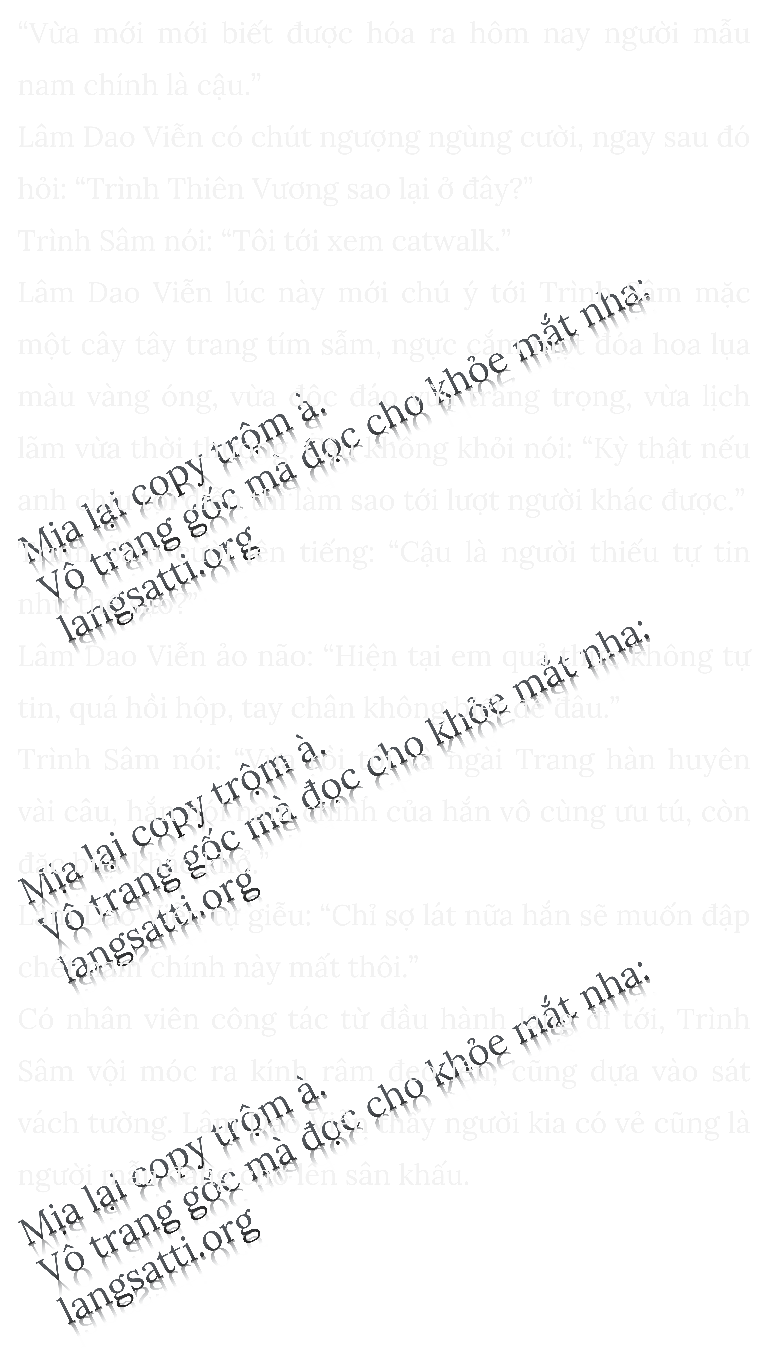 Phạm Tiểu Vũ đưa cậu vào phòng thay quần áo liền rời khỏi. Bên trong người mẫu ngồi ngay ngắn trật tự để chuẩn bị lên sân khấu, mùi nước hoa nồng đậm trong không khí. Lâm Dao Viễn đi vào thay đồ xong liền vội vàng đi ra, đứng ở hành lang hít thở.