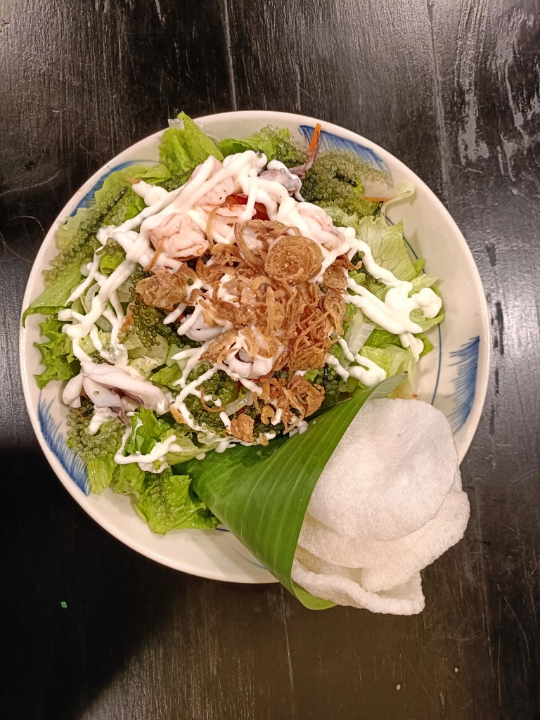 1 con cua thịt ở đây tầm 7-9 lạng, mỗi lạng tính 76k và nhân viên sẽ mời c ra xem họ cân con cua. Một người ăn xong 1 con cua này thì no luôn ko ăn thêm nổi cái gì nữa… Còn 2 người ăn 1 con thì sẽ còn bụng để thử thêm 1-2 món ăn nhẹ khác (như gỏi, súp). Nhưng hãy cân nhắc khi gọi đồ vì suất ăn ở đây thật sự nhiều. 1 đĩa gỏi to như cái chảo sâu lòng luôn á…
