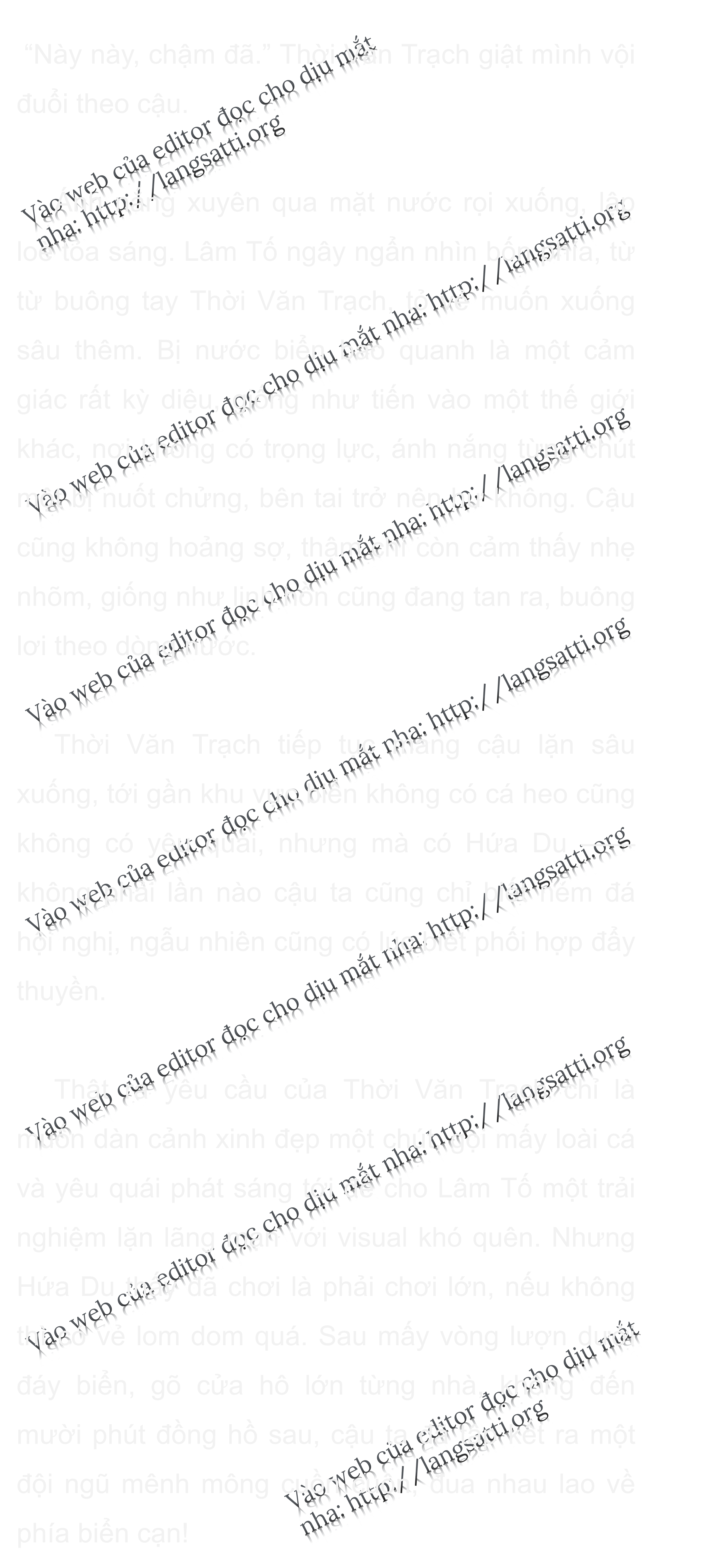 Lâm Tố phát hiện một con cá phát sáng trên tảng đá ngầm, liền rón rén tới gần nó, ra hiệu cho Thời Văn Trạch chụp ảnh giúp mình. Nhưng chưa kịp tạo dáng xong thì con cá đã bơi về phía bên kia, một khắc sau, nước biển bắt đầu hơi rung lên. Lâm Tố hoảng hốt quay đầu tìm kiếm bóng dáng Thời Văn Trạch, vô tình bỏ lỡ một mảnh đuôi cá lộng lẫy phát sáng vừa lúc phất qua. Ban đầu cảnh tượng đó tựa như hộp màu đổ xuống nước, lấm tấm những đốm vàng, rồi chúng dần dần tới gần- thì ra là rất nhiều cá phát sáng và yêu quái nhỏ đang bưng đủ loại tảo biển, san hô hình dáng kỳ quái xếp thành bó hoa. Lâm Tố bị vây ở giữa vòng tròn lòe loẹt này. Dù cậu có trí tưởng tượng vô biên đi chăng nữa, cũng chưa từng tưởng tượng ra nổi cảnh này, chỉ biết kinh ngạc ngắm nhìn. Càng lúc càng có nhiều yêu quái tụ về hướng này. Bởi vì truyền thông thần tốc lại qua loa nên hơn phân nửa hội này cũng không biết có chuyện gì xảy ra, chỉ tò mò chạy theo đám đông, nghe đồn đáy biển đang phát coupon giảm giá siêu thị, nghe đồn còn có show biểu diễn free, hình như còn có ai đó đang cử hành hôn lễ, nếu không sao còn nhờ bọn này ăn vận đẹp mắt tới góp vui?