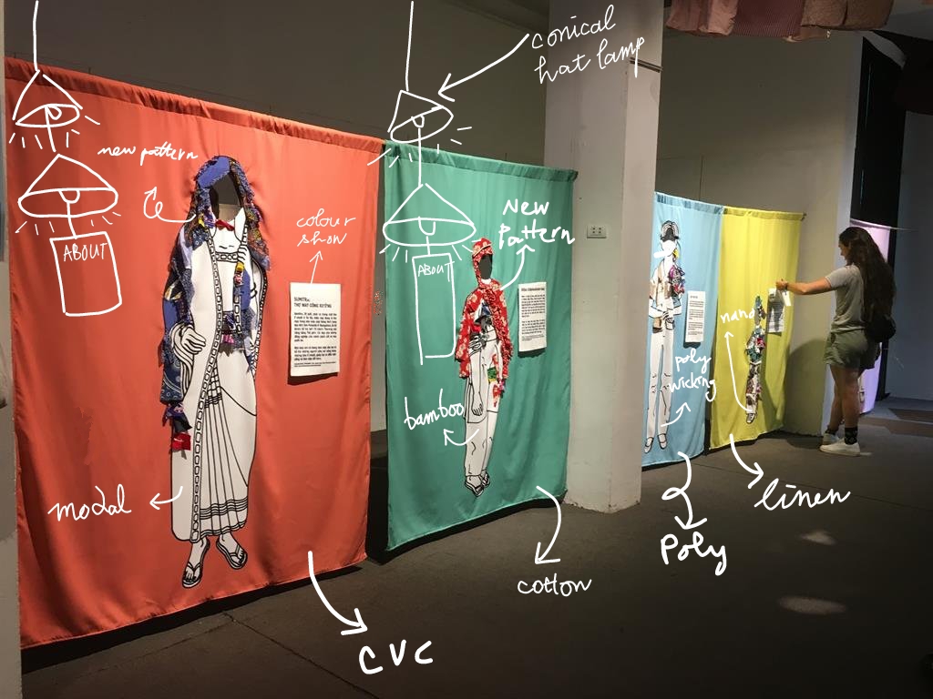 This is a way of introducing unique patterned fabric samples and making an impression of the handfeel of new materials in contrast to that of common ones like canvas, cotton, CVC, etc. It was the setting of a local fashion labour exhibition back in 2020.