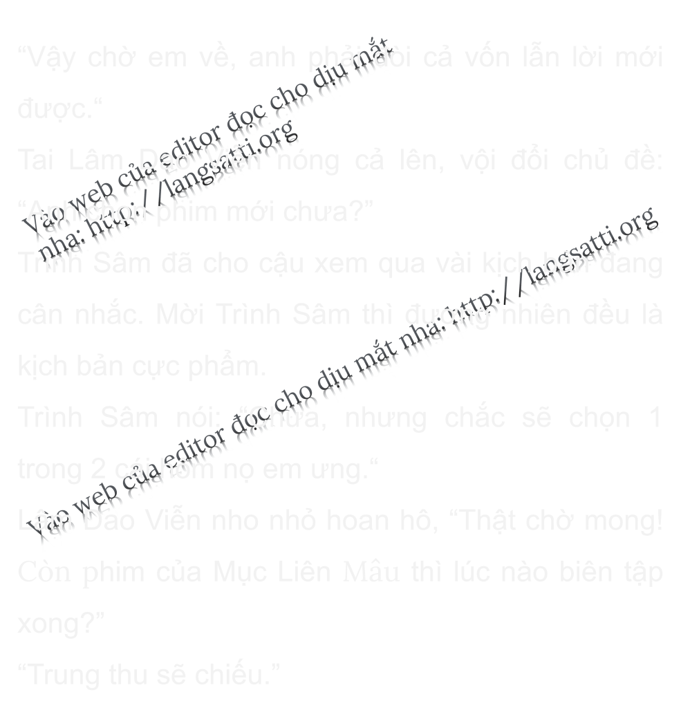 Từ khi tới đây cậu cơ hồ đã quên chuyện Trình Sâm, chỉ một lòng một dạ nghĩ làm thế nào dung nhập vào đoàn phim, làm thế nào diễn cho tốt, hoàn toàn không ngờ Trình Sâm sẽ nhờ Tưởng Tùng Thành chiếu cố mình, tức khắc sinh ra chút áy náy. Trình Sâm quay xong phim của Mục Liên Mâu thì chưa nhận phim mới, nghe nói đang chọn kịch bản. Do dự một hồi, cậu gọi sang.