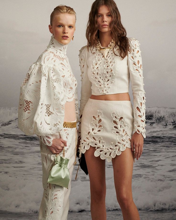 Quan sát kỹ trong hình, cô sẽ thấy các đường cắt, lỗ đục đều không có viền. Do đó, bề mặt vải có độ phẳng phiu, nhẵn mịn nguyên khối, không có chỗ nào vằn vệt hay gồ lên, khiến cho tổng thể bộ đồ không bị nhăn nhúm, không gãy nếp khi lên form, khi chuyển động, song đổi lại cũng không còn vẻ “thô mộc”, vintage như 2 dòng vải còn lại.