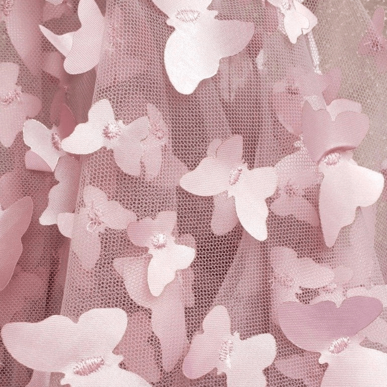Ngoài ra, nếu muốn tạo hiệu ứng 3D thì chỉ có thể dùng công nghệ laser cut này để thực hiện, ví dụ như trong bức ảnh mảnh vải xanh mint có họa tiết cánh bướm hơi xòe ra. Hoặc đôi khi, họa tiết 3D có thể được tạo nên một cách cầu kỳ hơn nữa: cắt laser rồi khâu đính vào vải đã dệt, ví dụ như hình sau: