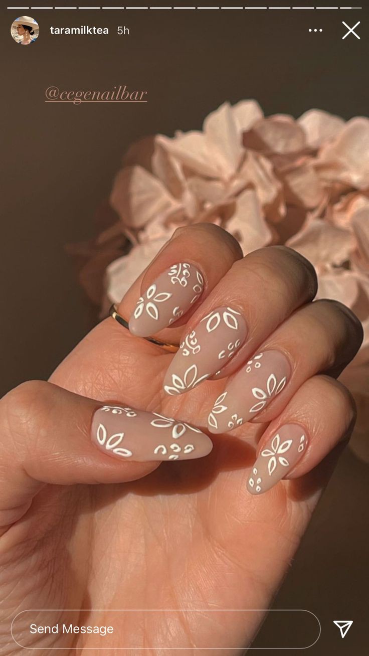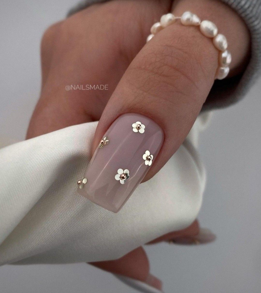 Nail hồng nude với chi tiết mắt mèo/ bóng kính/ viền vàng