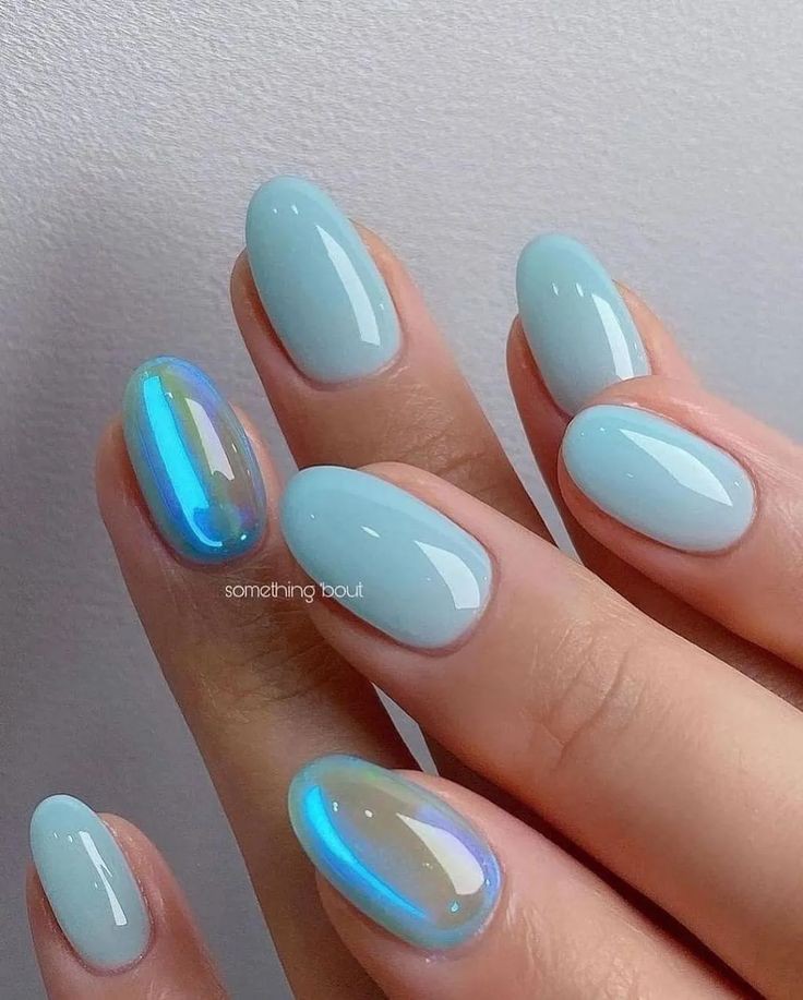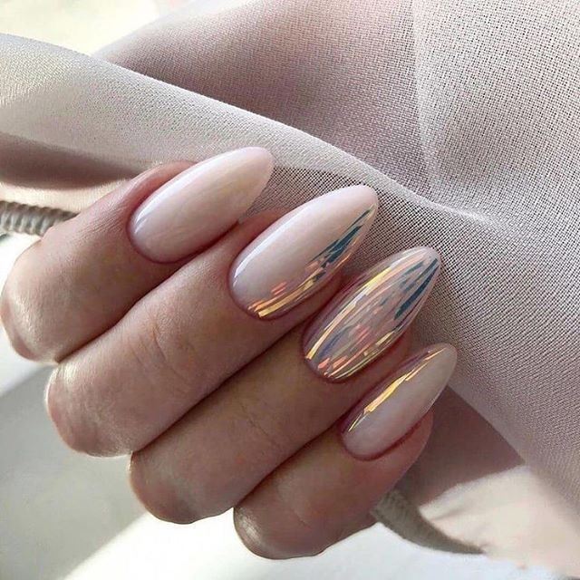 (Nude pink nails with cat-eye, high shine and golden lined effects)