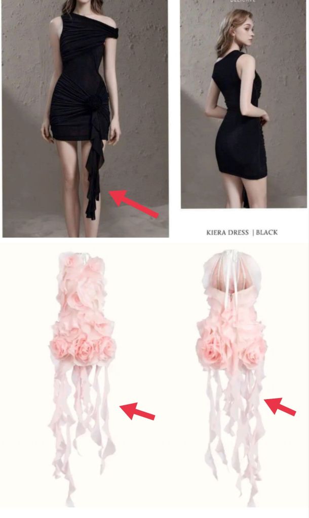 Ngay cả nếp gấp dưới ngực cũng y chang nhau, chứng tỏ bê nguyên cái rập của người ta ra mà cắt may rồi, không hề đầu tư thêm chút chất xám nào vào để nâng cấp form dáng. Thậm chí chất liệu nhìn cũng không sang hơn là mấy, vậy mà có thể đội giá gấp 5 lần! Lười sáng tạo nhưng cũng hiệu quả phết đó chứ!
