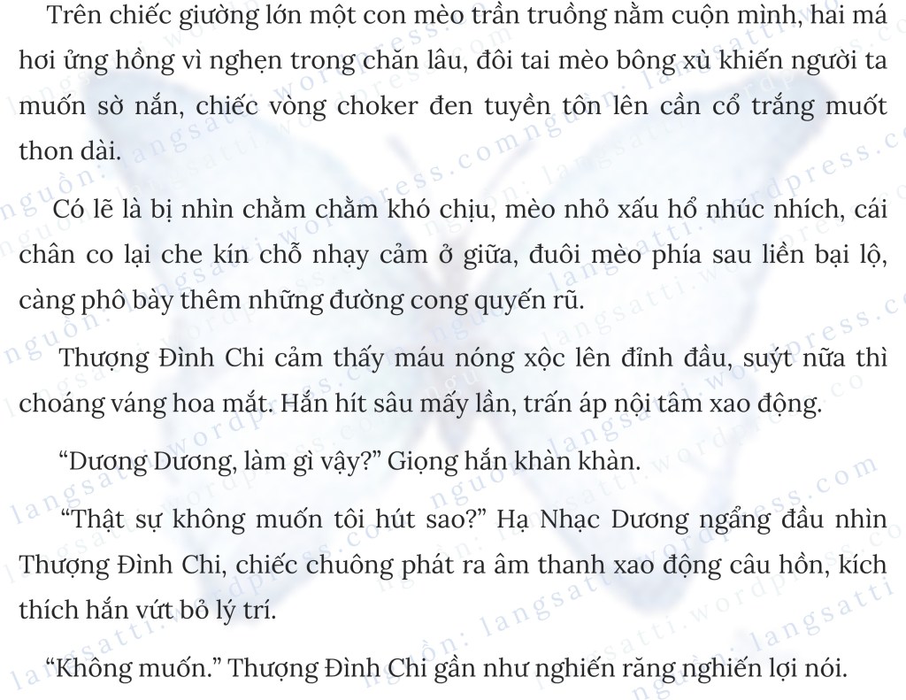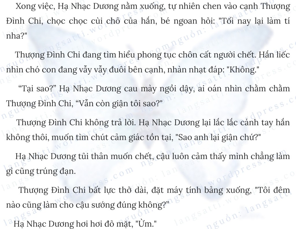 Đợi hơn mười phút, cuối cùng tiếng cửa phòng tắm vang lên, Hạ Nhạc Dương vội trùm kín chăn lên đầu, chờ Thượng Đình Chi trong căn phòng tối tăm.