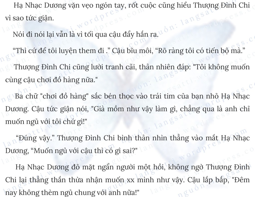 Thật ra “thực sự” của Thượng Đình Chi là có ý muốn xác nhận một mối quan hệ thật sự, nhưng bạn nhỏ Hạ Nhạc Dương tự động hiểu hai chữ này là hàng thật súng thật, cậu hỗn độn nói: “Vậy tại sao không thể để tôi ở trên?”