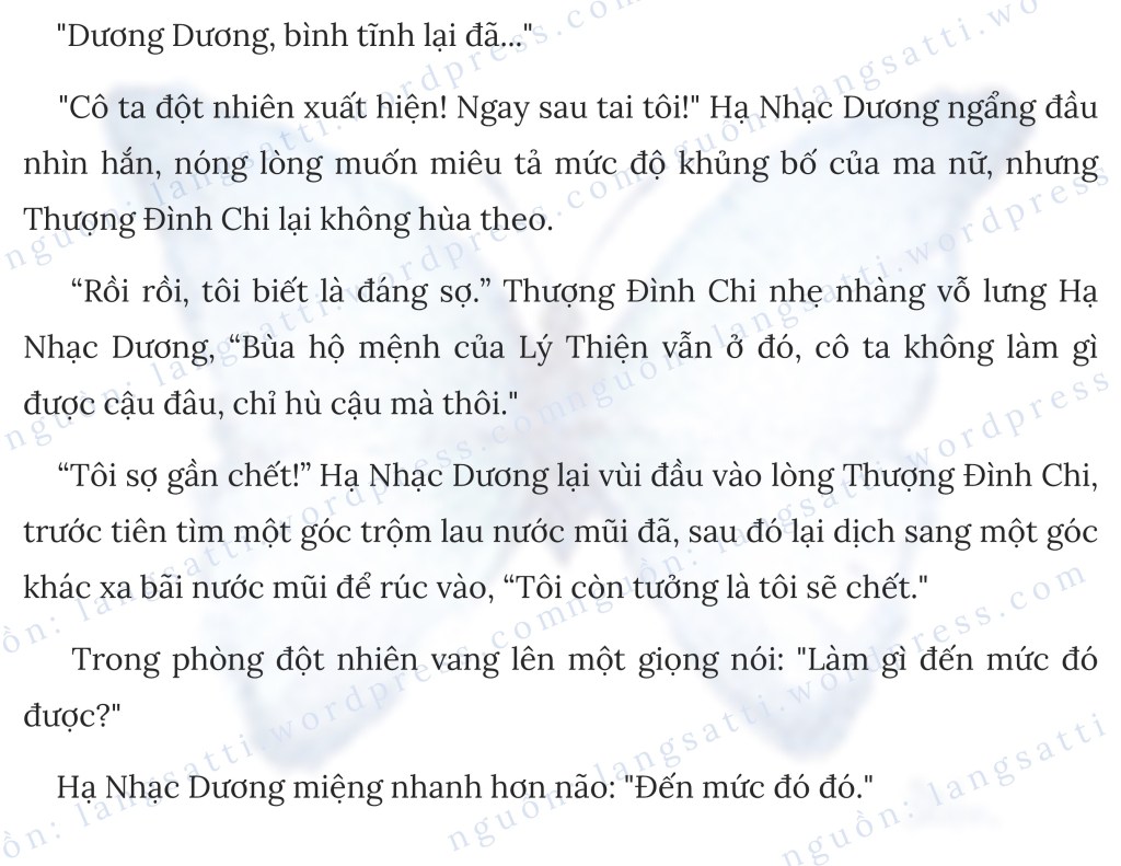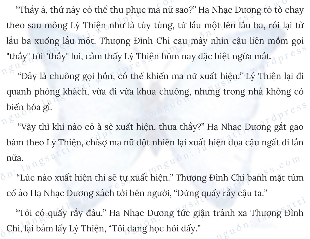 “Nghĩ xong rồi.” Ma nữ lướt đến bên người Hạ Nhạc Dương ngồi xuống, một luồng khí lạnh đột nhiên ùa vào tai khiến cậu bất giác rùng mình một cái.