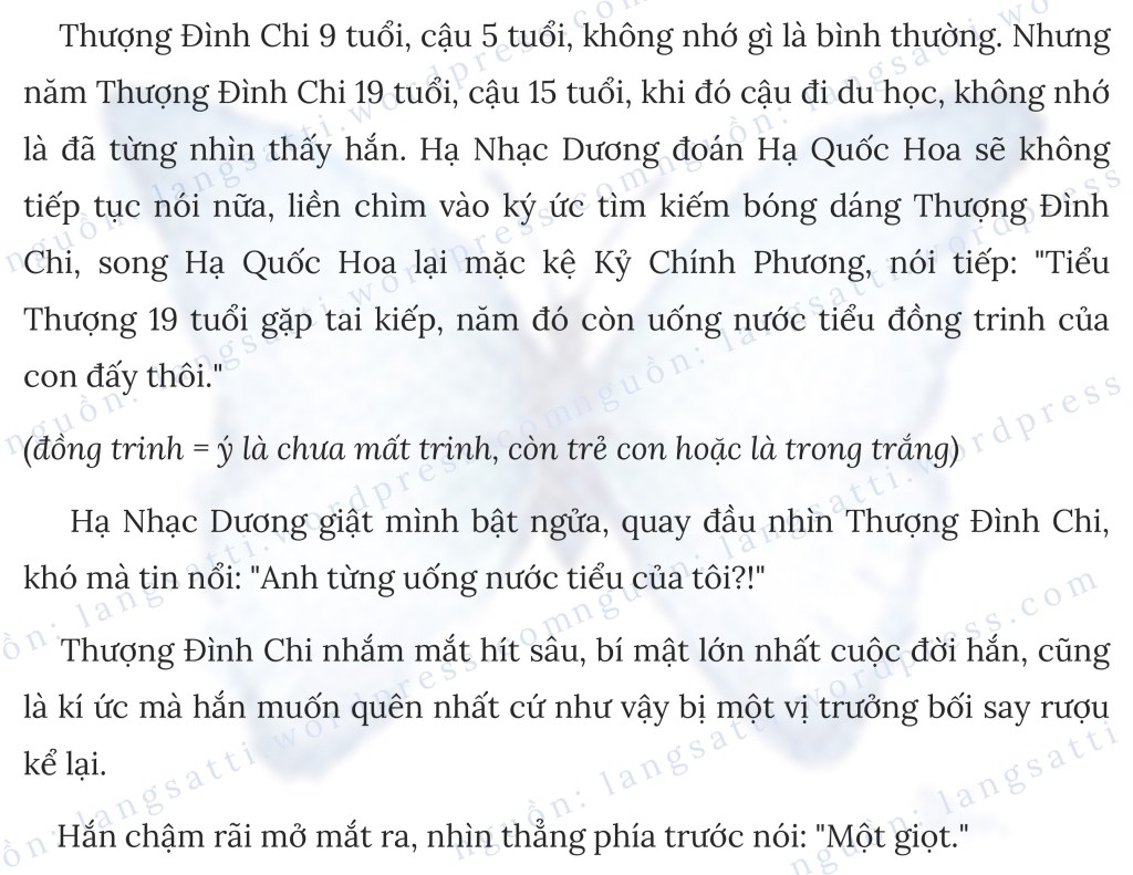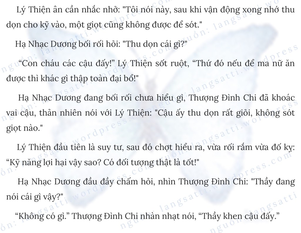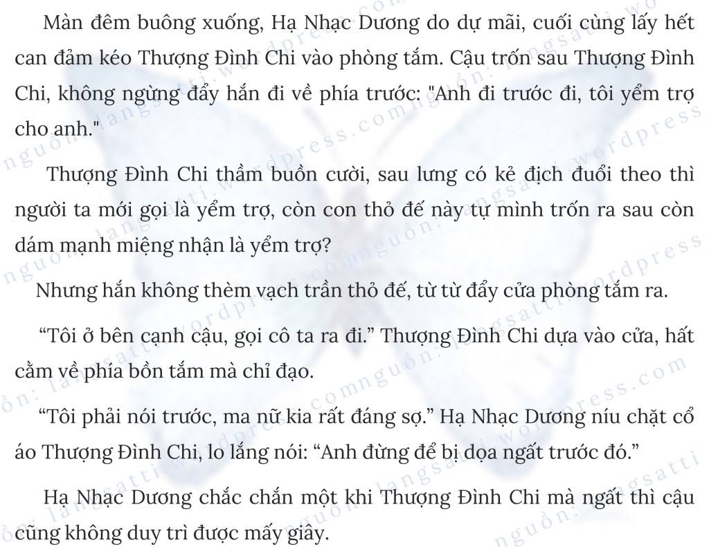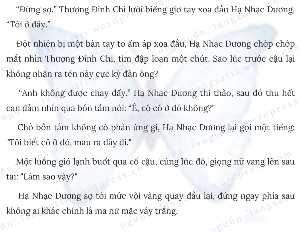 Hạ Nhạc Dương vừa nói xong, cửa phòng tắm đột nhiên bị đẩy ra, Thượng Đình Chi tình cờ đi vào, nhìn quanh hỏi Hạ Nhạc Dương: “Cậu đang nói chuyện với ma nữ?”