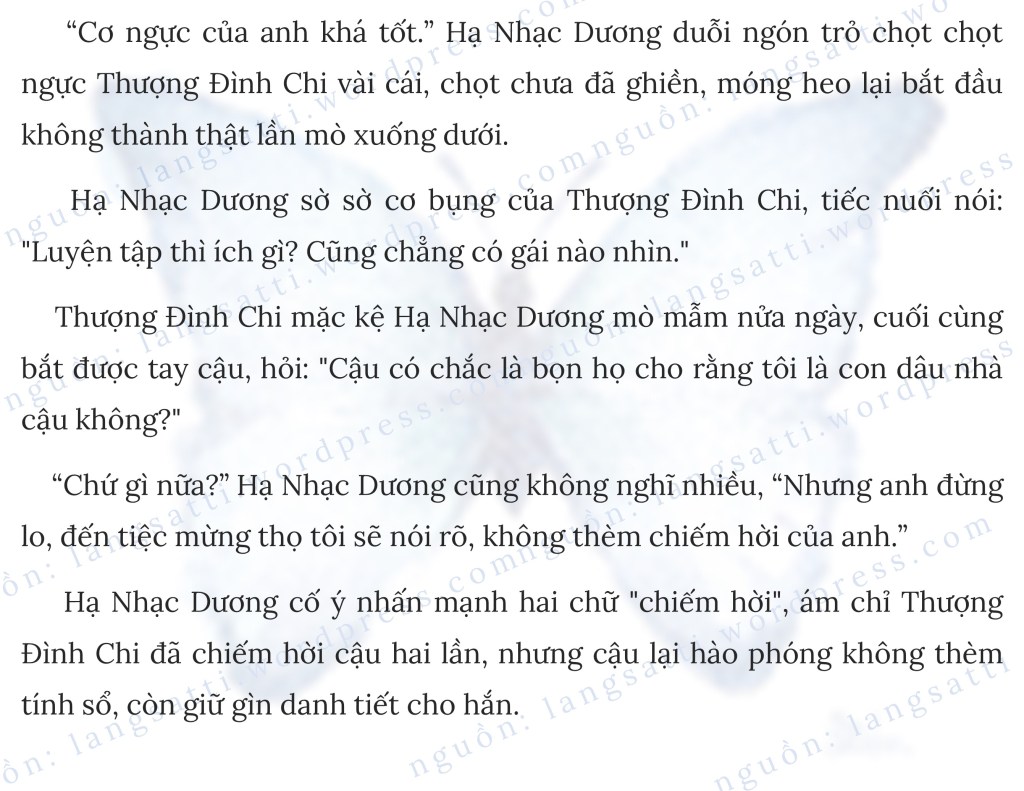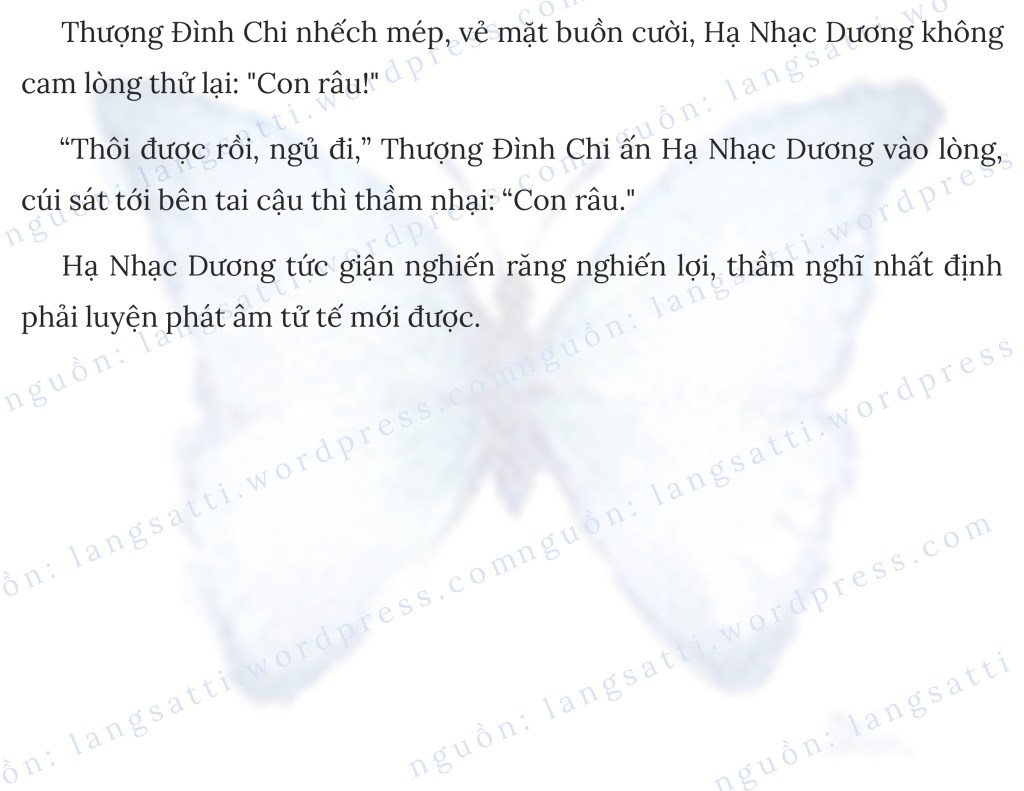 Lúc Thượng Đình Chi tắm xong đi vào thấy Hạ Nhạc Dương còn đang mặc sơ mi của mình, hai chân như một con gấu Koala kẹp lấy đống chăn, lộ ra cặp đùi trắng muốt.